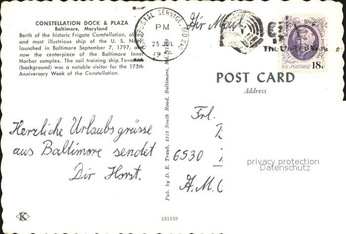 alte Postkarte Segelschiffe Constellation Dock and Plaza Baltimore Maryland postalisch gelaufen Erhaltung siehe scans