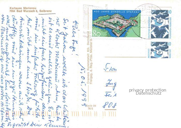 74157701 alte Postkarte Seibranz Bad Wurzach BW Kartause-Marienau Kloster Fliegeraufnahme Kirche Wald Felder Luftbild postalisch gelaufen Fliegeraufnahme Erhaltung siehe scans [Karloger] KatCode: 11110008436010
