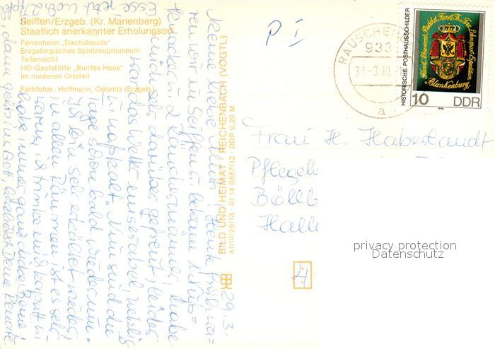 73106378 alte Postkarte Seiffen Erzgebirge Ferienheim Dachsbaude Spielzeugmuseum HO Gaststaette Buntes Haus postalisch gelaufen Erhaltung siehe scans [KathaD81] KatCode: 11110014181350