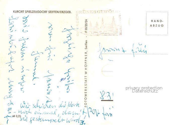 72643970 alte Postkarte Seiffen Erzgebirge Ortsansicht mit Kirche Spielzeugdorf Kurort Handabzug postalisch gelaufen Erhaltung siehe scans [FriedD77] KatCode: 11110014181350