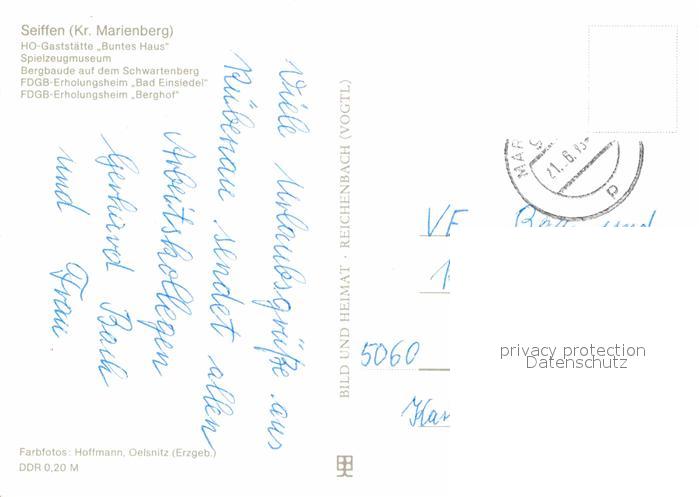 72742996 alte Postkarte Seiffen Erzgebirge Restaurant Buntes Haus Spielzeugmuseum Bergbaude-auf-dem-Schwartenberg Erholungsheime Bad Einsiedeln und Berghof postalisch gelaufen Erhaltung siehe scans [LiesaD40] KatCode: 11110014181350
