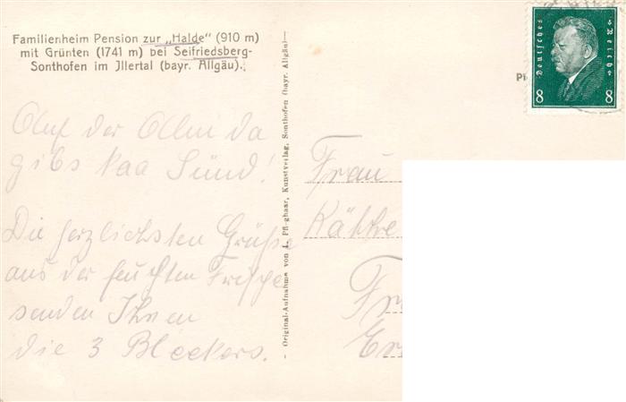 73876485 alte Postkarte Seifriedsberg Sonthofen Familienheim Pension zur Halde mit Gruenten postalisch gelaufen Erhaltung siehe scans [FriedD77] KatCode: 11110009780115