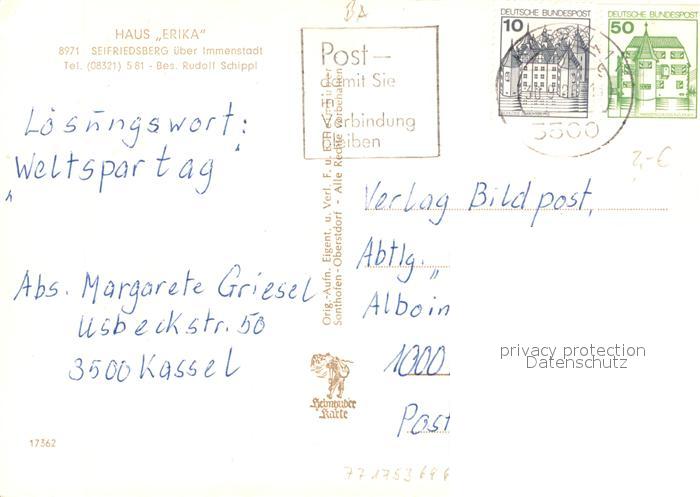 73652817 alte Postkarte Seifriedsberg Sonthofen Gaestehaus Pension Haus Erika Allgaeuer Alpen postalisch gelaufen Erhaltung siehe scans [FriedD77] KatCode: 11110009780115