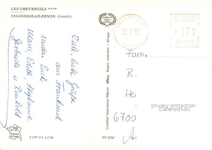 13231690 carte postale Seignosse Le Penon Les Chevreuils Gaststaette Tennisplatz Hirsch postalisch gelaufen Erhaltung siehe scans [FriedD77] KatCode: 11170040140296