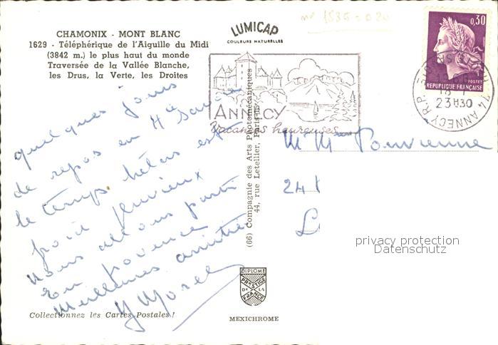 alte Postkarte Seilbahn Aiguille du Midi Chamonix Mont Blanc Vallee Blanche Drus Verte Droites postalisch gelaufen