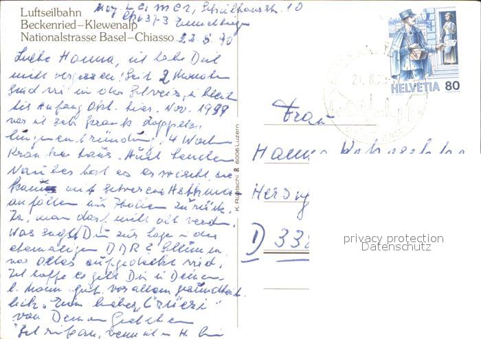alte Postkarte Seilbahn Beckenried-Klewenalp Nationalstrasse Basel-Chiasso postalisch gelaufen Erhaltung siehe scans