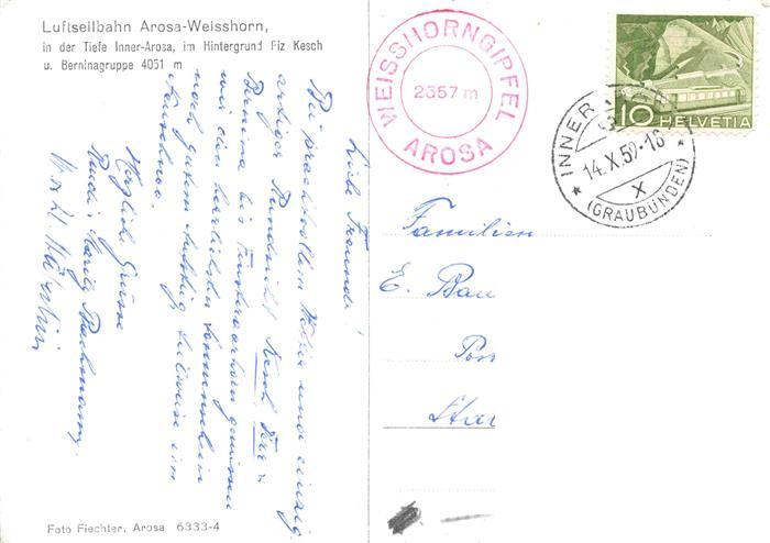 74012510 alte Postkarte Seilbahn Cable-Car Telepherique Arosa Weisshorn Hintergrund Fiz Kesch postalisch gelaufen Erhaltung siehe scans [SanaeD93] KatCode: 22040000000400