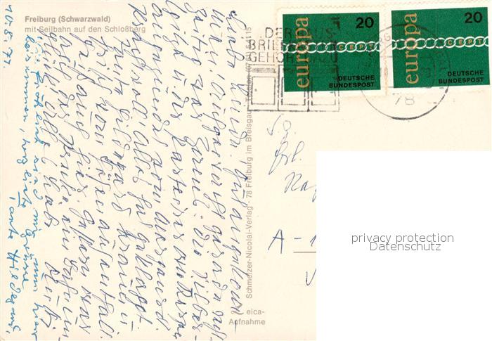 73899069 alte Postkarte Seilbahn Cable-Car Telepherique Freiburg Schwarzwald Schlossberg postalisch gelaufen Erhaltung siehe scans [IrynaD87] KatCode: 22040000000400