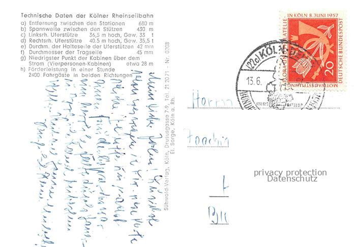74056230 alte Postkarte Seilbahn Cable-Car Telepherique Koeln Rhein postalisch gelaufen Erhaltung siehe scans [SanaeD93] KatCode: 22040000000400