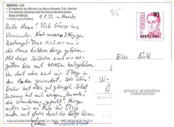 74017031 alte Postkarte Seilbahn Cable-Car Telepherique Venezuela Merida postalisch gelaufen Erhaltung siehe scans [IrynaD87] KatCode: 22040000000400