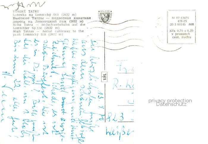 73901268 alte Postkarte Seilbahn Cable-Car Telepherique Vysoke Tatry Lanovka Lamnicky postalisch gelaufen Erhaltung siehe scans [IrynaD87] KatCode: 22040000000400