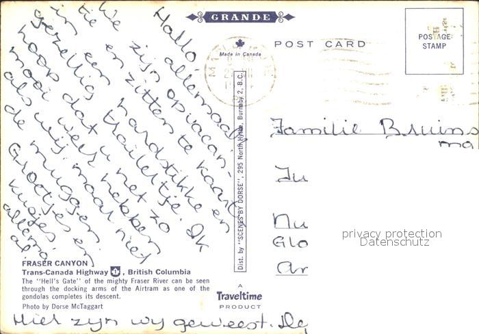 alte Postkarte Seilbahn Fraser Canyon Trans-Canada Highway Hell’s Gate postalisch gelaufen Erhaltung siehe scans