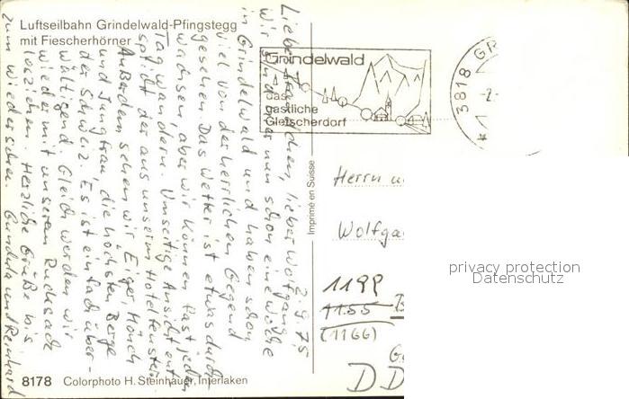 alte Postkarte Seilbahn Grindelwald-Pfingstegg Fiescherhoerner postalisch gelaufen Erhaltung siehe scans