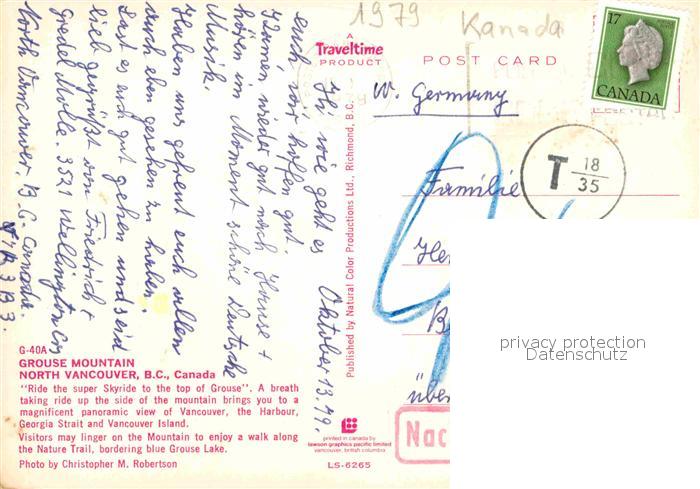 alte Postkarte Seilbahn Grouse Mountain North Vancouver Canada postalisch gelaufen Erhaltung siehe scans [PaolaD17]