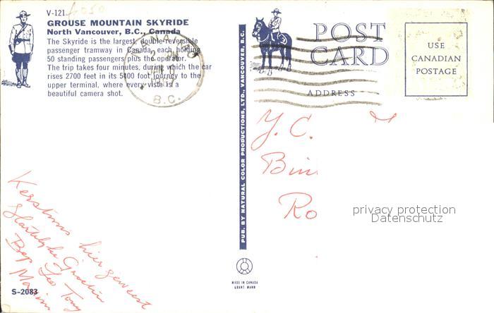 alte Postkarte Seilbahn Grouse Mountain Skyride North Vancouver postalisch gelaufen Erhaltung siehe scans