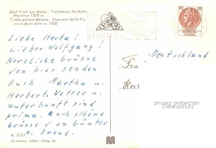 alte Postkarte Seilbahn Hochmut Dorf Tirol Meran Talstation postalisch gelaufen Erhaltung siehe scans [PaolaD17]