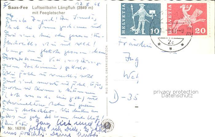 alte Postkarte Seilbahn Laengfluh Saas-Fee Feegletscher postalisch gelaufen Erhaltung siehe scans