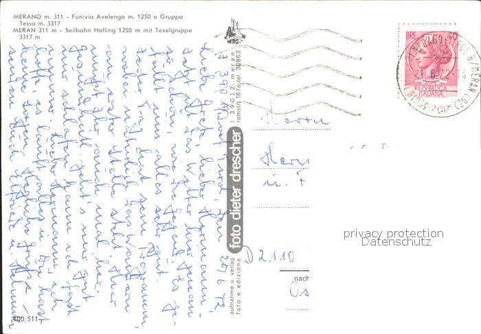 alte Postkarte Seilbahn Merano Funivia Avelengo Gruppo Tessa postalisch gelaufen Erhaltung siehe scans