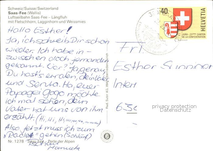 alte Postkarte Seilbahn Saas-Fee-Laengfluh Fletschhorn Lagginhorn Weissmies postalisch gelaufen Erhaltung siehe scans
