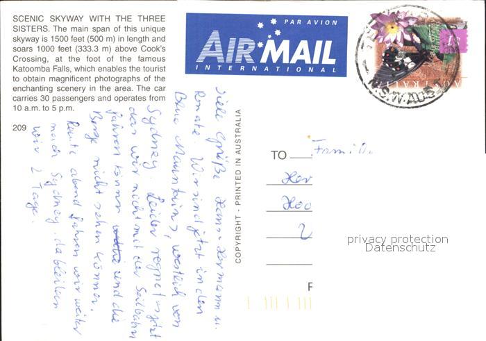 alte Postkarte Seilbahn Scenic Skyway Three Sisters Katoomba Falls postalisch gelaufen Erhaltung siehe scans