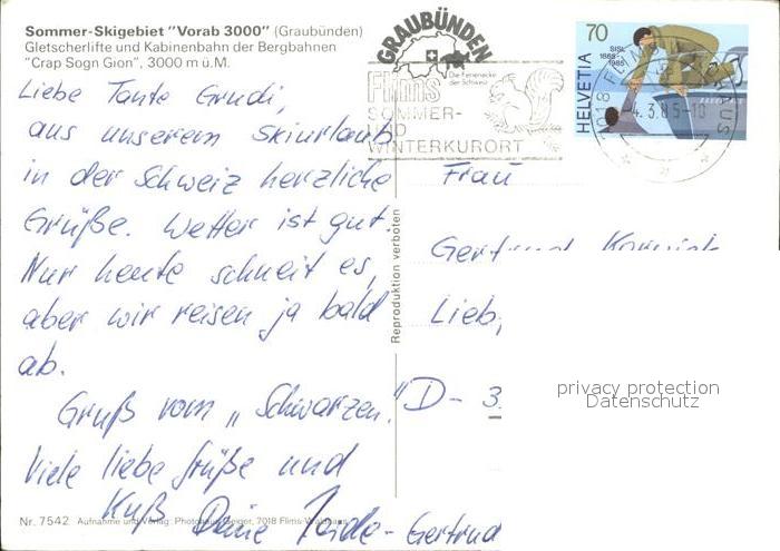 alte Postkarte Seilbahn Skigebiet Vorab 3000 Graubuenden Crap Sogn Gion postalisch gelaufen Erhaltung siehe scans