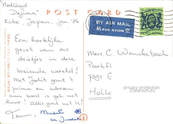 alte Postkarte Seilbahn Sumanoura Ropeway Fishing Park Kobe Japan postalisch gelaufen Erhaltung siehe scans