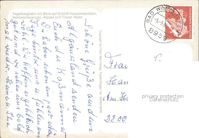 alte Postkarte Seilbahn Tegelbergbahn Schloss Neuschwanstein Hohenschwangau Alpsee Tiroler Alpen postalisch gelaufen Erhaltung siehe scans