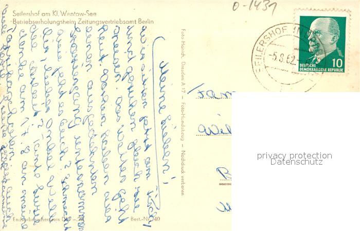 43350444 alte Postkarte Seilershof Betriebserholungsheim Zeitungsvertriebsamt Berlin am kleinen Wentowsee postalisch gelaufen Erhaltung siehe scans [FriedD77] KatCode: 11110012065100