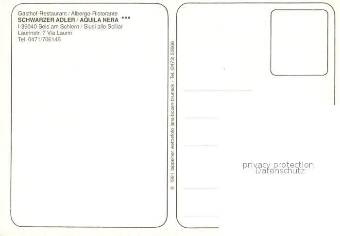 73642907 Seis Schlern Gasthof Restaurant Schwarzer Adler Albergo Ristorante Aquila Nera postalisch nicht gelaufen Erhaltung siehe scans [FriedD77] KatCode: