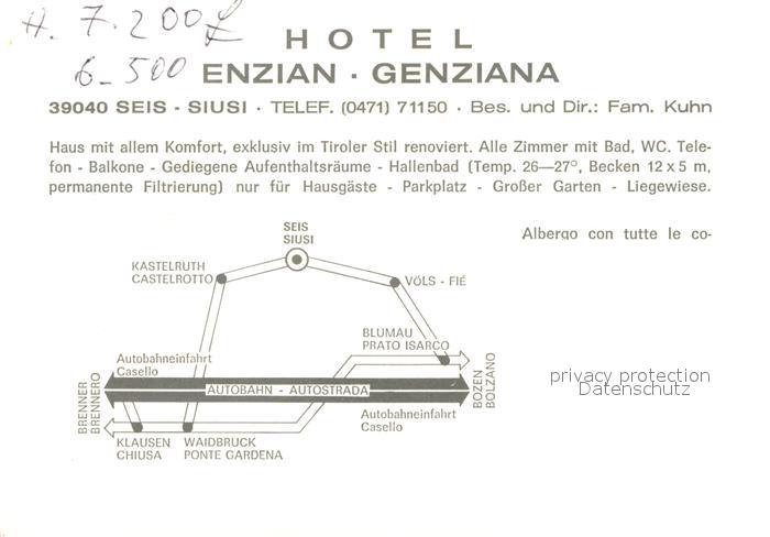 72960795 Seis Schlern Hotel Enzian Genziana postalisch nicht gelaufen Werbekarte (keine Postkarte) Erhaltung siehe scans [LiesaD40] KatCode: