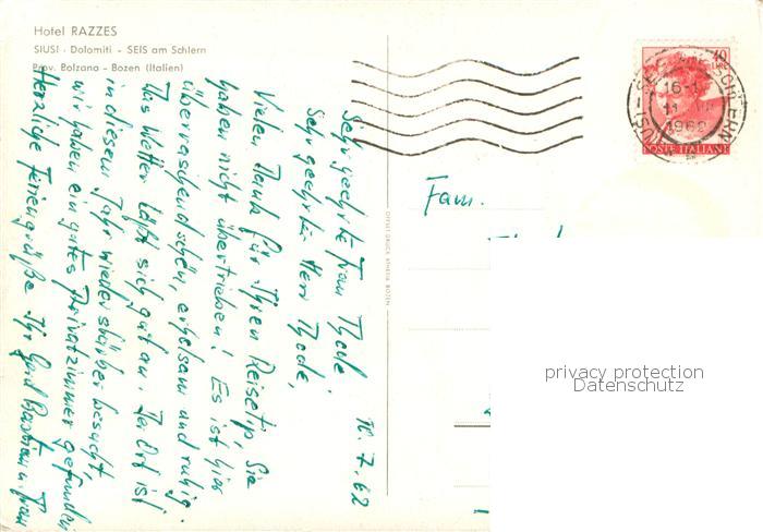 73779881 alte Postkarte Seis Schlern Hotel Razzes postalisch gelaufen Erhaltung siehe scans [WerneD78] KatCode: