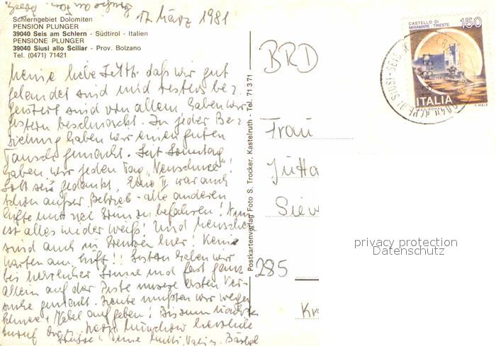 72666522 alte Postkarte Seis Schlern Pension Plunger Schlerngebiet Dolomiten postalisch gelaufen Erhaltung siehe scans [FriedD77] KatCode: