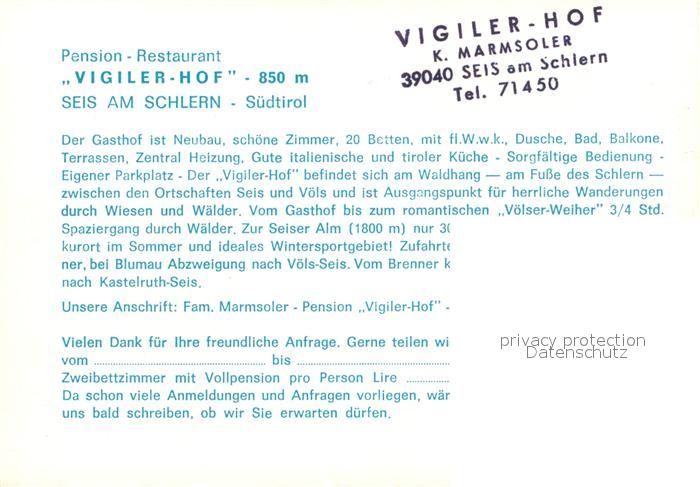 73480376 Seis Schlern Pension Restaurant Vigiler Hof postalisch nicht gelaufen Werbekarte (keine Postkarte) Erhaltung siehe scans [KathaD81] KatCode: