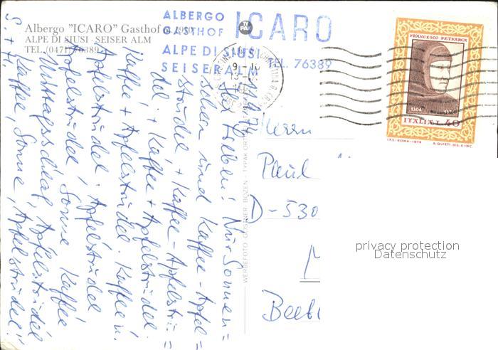 old postcard Seiser Alm Dolomiten Albergo Icaro postalisch gelaufen Erhaltung siehe scans