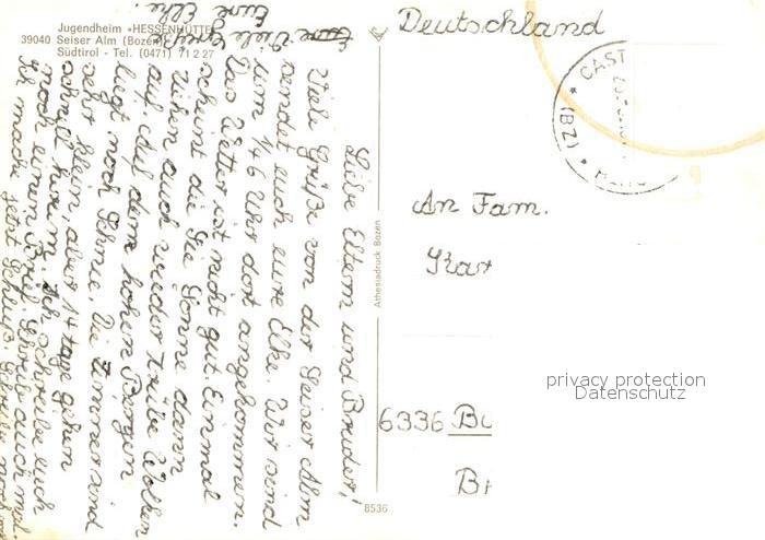 old postcard Seiser Alm Dolomiten Jugendheim Hessenhuette postalisch gelaufen Erhaltung siehe scans [NatalD47]