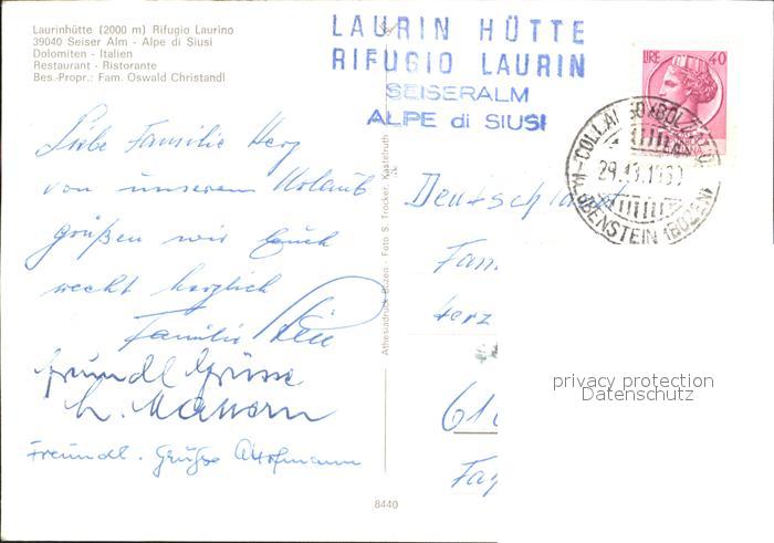 old postcard Seiser Alm Dolomiten Laurinhuette Rifugio Laurino Berghuette Dolomiten postalisch gelaufen Erhaltung siehe scans