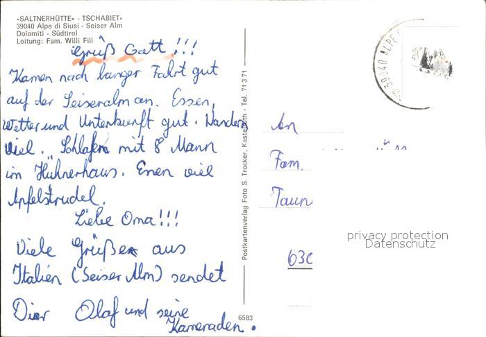 old postcard Seiser Alm Dolomiten Saltnerhuette Tschabiet postalisch gelaufen Erhaltung siehe scans