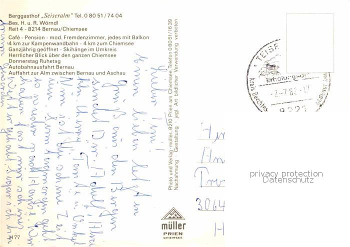72630782 alte Postkarte Seiseralm Chiemgau Berggasthof Woerndl postalisch gelaufen Erhaltung siehe scans [LiesaD40] KatCode: 11110009187123