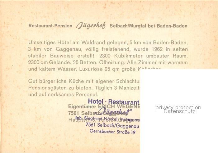 73323360 Selbach Gaggenau Restaurant Pension Jaegerhof im Murgtal postalisch nicht gelaufen Werbekarte (keine Postkarte) Erhaltung siehe scans [FriedD77] KatCode: 11110008216015
