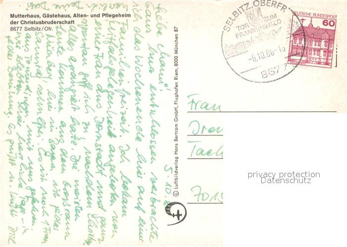 72981613 alte Postkarte Selbitz Oberfranken Fliegeraufnahme Mutterhaus Gaestehaus Christusbruderschaft postalisch gelaufen Erhaltung siehe scans [LiesaD40] KatCode: 11110009475171
