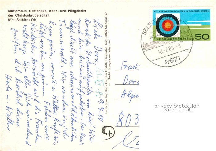 72664645 alte Postkarte Selbitz Oberfranken Fliegeraufnahme Mutterhaus Gaestehaus der Christusbruderschaft postalisch gelaufen Erhaltung siehe scans [AndreD76] KatCode: 11110009475171