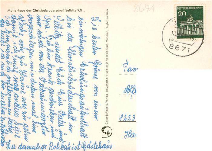 73941300 alte Postkarte Selbitz Oberfranken Mutterhaus der Christusbruderschaft postalisch gelaufen Fliegeraufnahme Erhaltung siehe scans [FriedD77] KatCode: 11110009475171