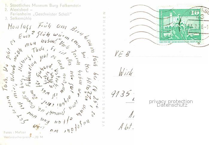 72656968 alte Postkarte Selketal Museum Burg Falkenstein Alexisbad Ferienheim Geschwister Scholl Selkem?hle postalisch gelaufen Erhaltung siehe scans [LiesaD40] KatCode: 11110015085310