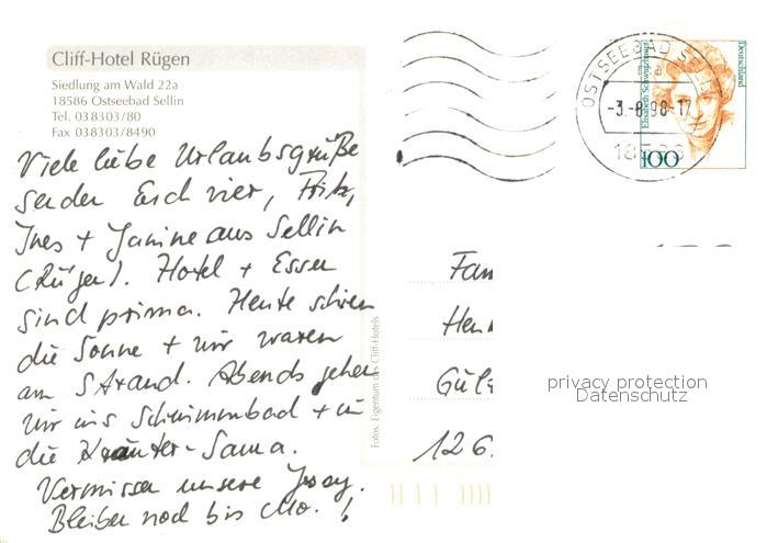 73652369 alte Postkarte Sellin Ruegen Cliff Hotel Ruegen Gastraeume Strand Fliegeraufnahme postalisch gelaufen Erhaltung siehe scans [WerneD78] KatCode: 11110013061038