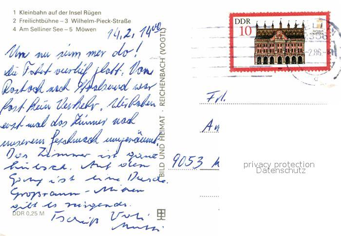 72729705 alte Postkarte Sellin Ruegen Kleinbahn Freilichtbuehne Wilhelm Pieck Strasse Selliner See Moewen postalisch gelaufen Erhaltung siehe scans [FriedD77] KatCode: 11110013061038