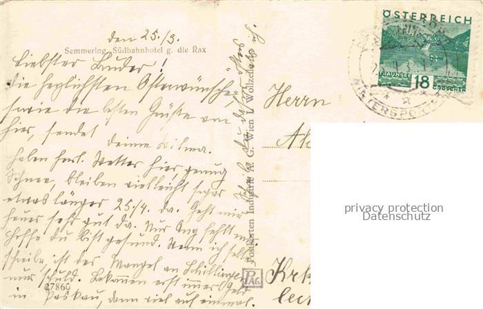 74123559 alte Postkarte Semmering Niederoesterreich AT Suedbahnhotel mit der Rax postalisch gelaufen Erhaltung siehe scans [WerneD78] KatCode: 11390122031838