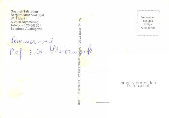 12776657 Semmering Niederoesterreich Gasthof Berglift Hirschenkogel postalisch nicht gelaufen Erhaltung siehe scans [WerneD78] KatCode: 11390122031838