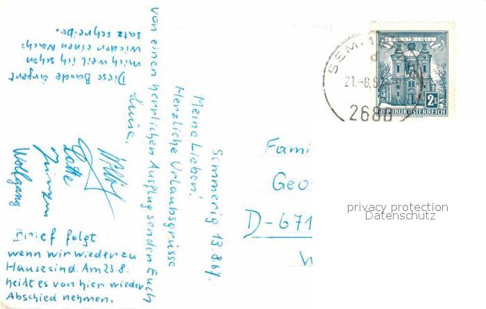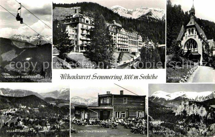 72789267 alte Postkarte Semmering Niederoesterreich Sessellift Hirschenkogel Grand Hotel Panhans Kircherl Villenviertel Liechtensteinhaus Alpenpanorama postalisch gelaufen Erhaltung siehe scans [FriedD77] KatCode: 11390122031838