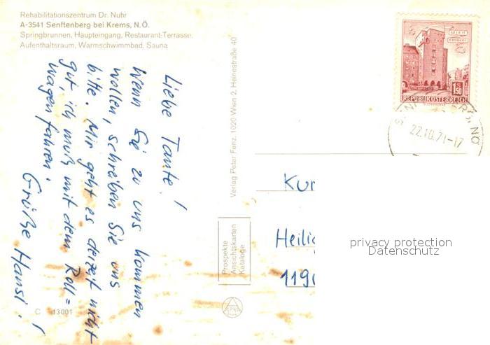 73042471 alte Postkarte Senftenberg Niederoesterreich Rehabilitationszentrum Dr Nuhr Springbrunnen Hallenbad Sauna Wappen postalisch gelaufen Erhaltung siehe scans [FriedD77] KatCode: 11390124031343