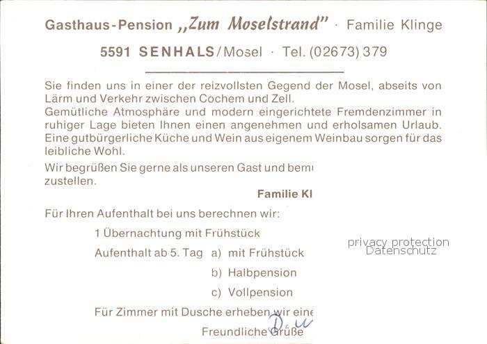 71972841 Senheim-Senhals Gasthaus Pension Zum Moselstrand postalisch nicht gelaufen Werbekarte (keine Postkarte) Erhaltung siehe scans KatCode: 11110007135079